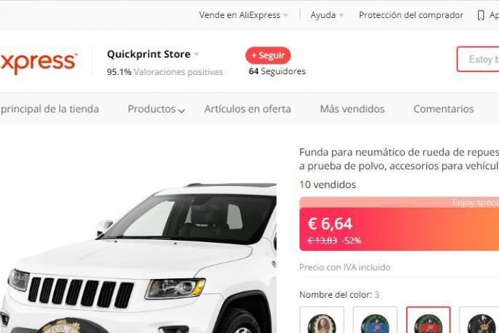 En las capturas se puede ver que ha sido rebajada un 52%, con lo que ha pasado de 13,66 euros a 6,55. “Funda para neumático de rueda de repuesto, protector para Suzuki, líder de España, a prueba de polvo, accesorios para vehículos de 14, 15, 16 y 17 pulgadas”, se puede leer en la descripción del producto de la página web. Y añaden: “10 vendidos”.