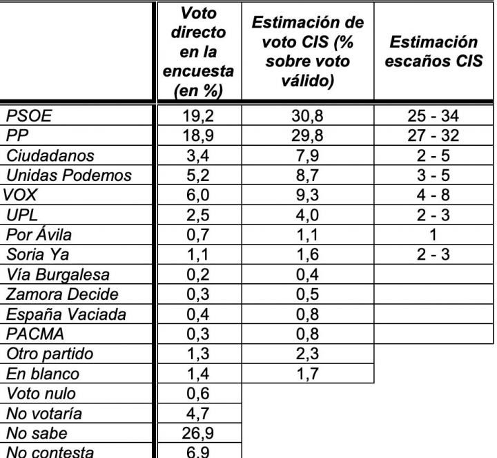 El CIS hace una proyección de escaños de la siguiente forma: PSOE (25-34), PP (27-32), Vox (4-8), Unidas Podemos (3-5), Cs (2-5), UPL (2-3), Soria Ya (2-3) y Por Ávila (1).