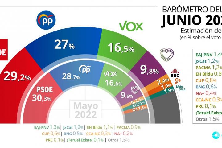 Por otra parte, Vox se mantiene en términos de estabilidad y retiene la tercera posición con el 16,5% en estimación de voto -eso sí, es una décima menos que en mayo-. Por su parte, Unidas Podemos crece dos décimas y se coloca en el 9,8%.