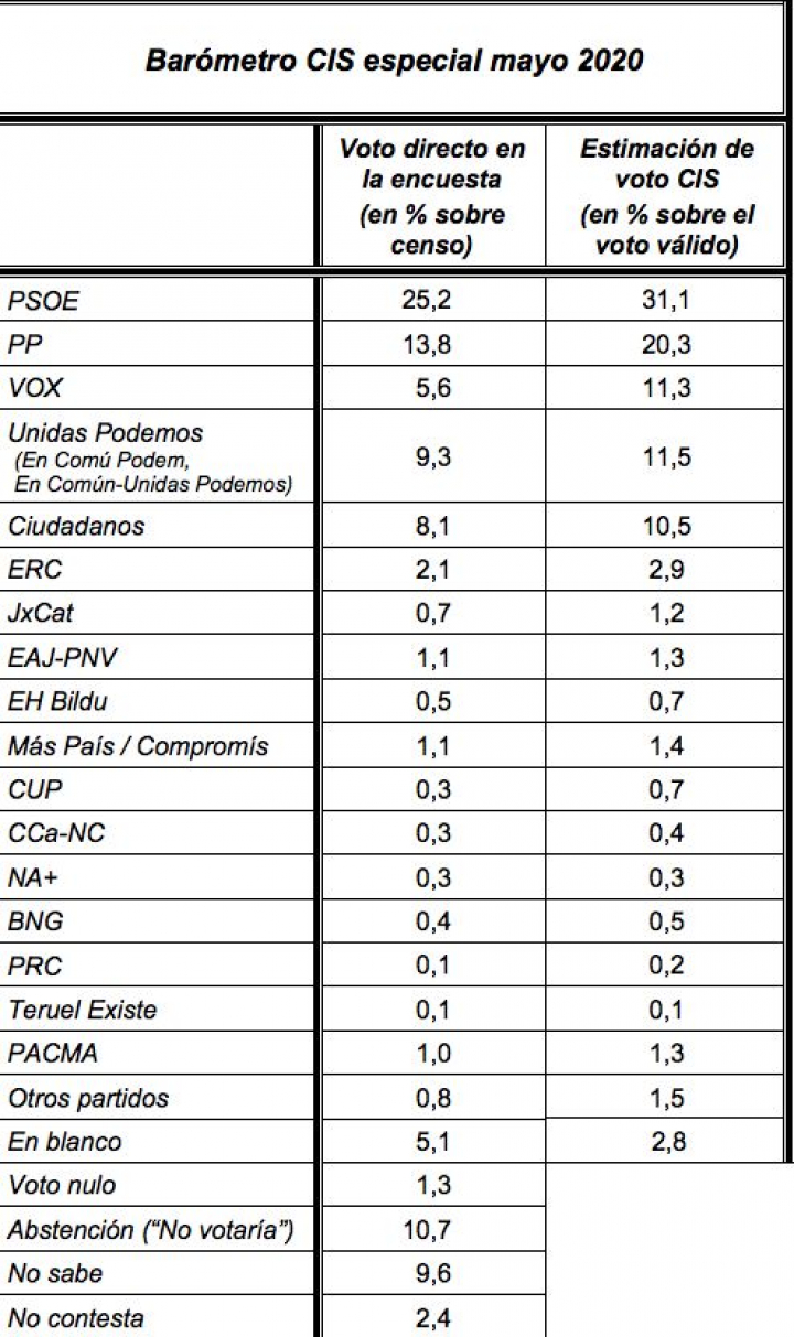 El PSOE ganaría hoy las elecciones con un apoyo del 31,1% seguido del PP, con un 20,3%, mientras que Unidas Podemos superaría a Vox como tercera fuerza política (11,5% frente a un 11,3%), según el barómetro del CIS correspondiente al mes de abril, que sitúa a Ciudadanos en quinta posición (10,5%).