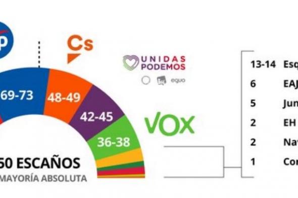 Ciudadanos sería tercera fuerza con entre 40 y 50 escaños, mientras que Unidas Podemos sería cuarta fuerza con entre 45 y 60.