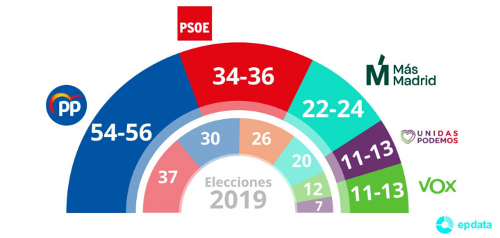 El PSOE perdería 9 escaños (lograría 28 frente a los 37 de 2019), Más Madrid mejoraría con cinco sillas en la Asamblea (tendría 25 frente a los 20 que logró), Unidas Podemos también ascendería (se haría con 11 escaños frente a los 7 de hace dos años) y Ciudadanos no llegaría al 5 % necesario para tener representación, por lo que se quedaría fuera del Parlamento regional pese a haber tenido 26 diputados en 2019.