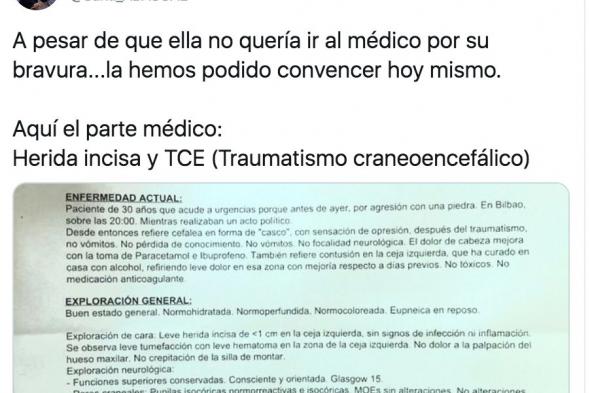 En dicho parte médico se habla de la paciente acudió a urgencias “porque antes de ayer, por agresión con una piedra” (sic). Y añade: “En Bilbao, sobre las 20:00. Mientras realizaba un acto político”.
