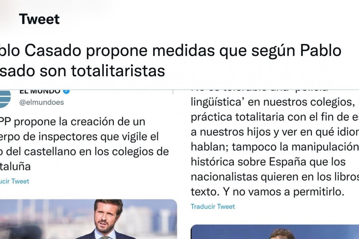 “Pablo Casado propone medidas que según Pablo Casado son totalitaristas”, ha escrito el usuario de Twitter que ha publicado los dos tuits. Un mensaje que tiene en pocas horas más de 3.800 compartidos y casi 10.000 ‘me gusta’.