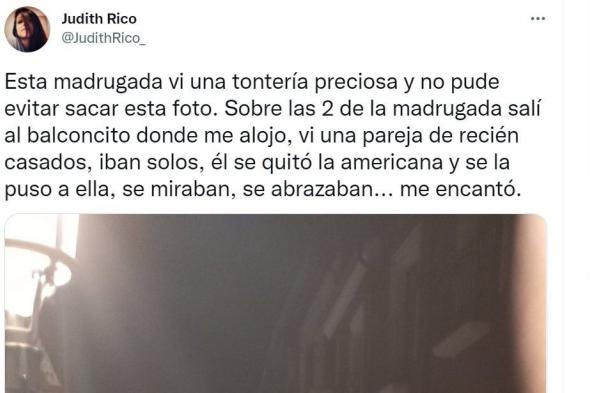 “Esta madrugada vi una tontería preciosa y no pude evitar sacar esta foto. Sobre las 2 de la madrugada salí al balconcito donde me alojo, vi una pareja de recién casados, iban solos, él se quitó la americana y se la puso a ella, se miraban, se abrazaban... me encantó”, ha escrito Rico.