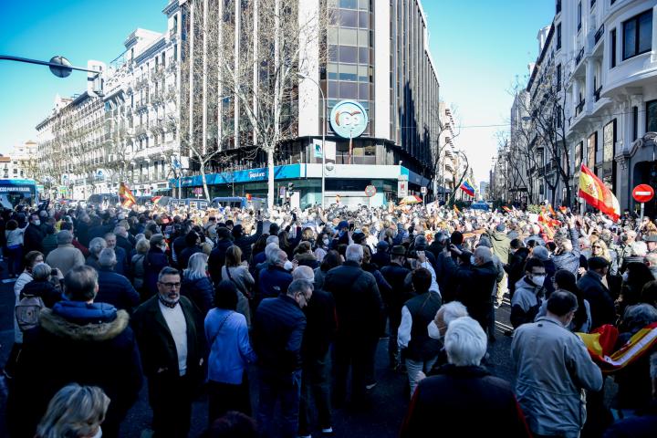 Centenares de personas se concentran desde antes del mediodía en la calle Génova de Madrid, frente a la sede nacional del PP, en apoyo a la presidenta de la Comunidad de Madrid, Isabel Díaz Ayuso, y en contra de la dirección del partido y de su presidente, Pablo Casado.