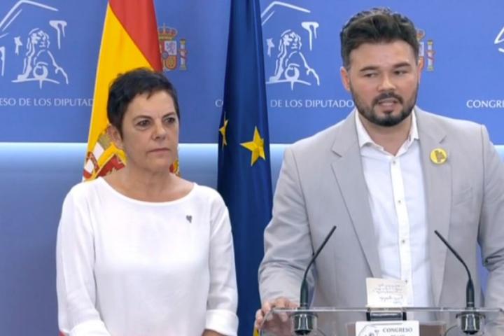 Gabriel Rufián y Mertxe Aizpurua, portavoces de ambas formaciones, han comparecido en el Congreso de los Diputados para anunciar su postura en la votación de este jueves ante la situación de bloqueo en las negociaciones entre Podemos y PSOE.