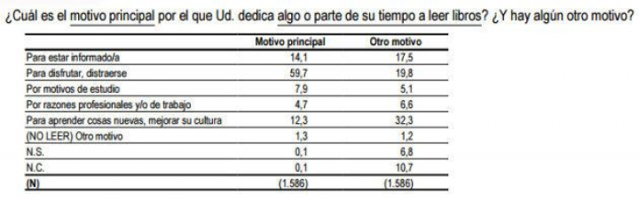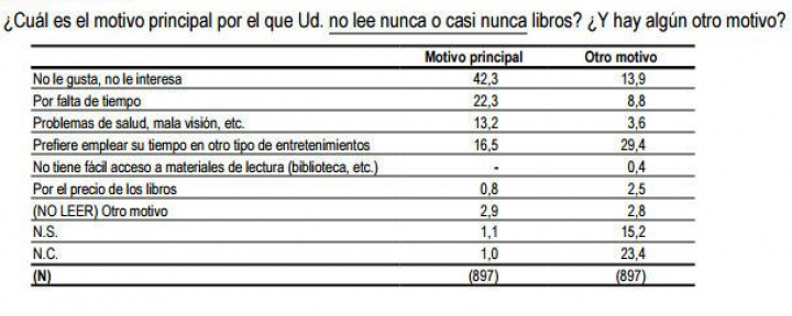 Un 18,3% de los españoles no lee nunca. El 42,3% de ellos asegura que la lectura no les gusta o no les interesa aunque, si se le suman los que argumentan que prefieren "emplear el tiempo en otro tipo de entretenimiento", que es casi lo mismo, aumenta al 57,8%. Un 22,3% de los encuestados culpa a la falta de tiempo. Las personas con menos estudios citan más la primera causa que la segunda.