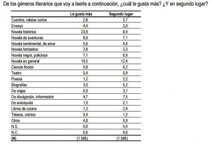 Según el CIS, el género preferido en España es la novela histórica (23,8%) seguido de la novela "en general" (19,5%) y la de aventuras (8,9%), lo que resulta sorprendente dado el comentado boom de la novela negra. Se leen más ensayos y biografías que relatos o novela fantástica, y se lee más poesía, libros de autoayuda y manuales de cocina que cómics o teatro, con diferencia la opción menos popular.