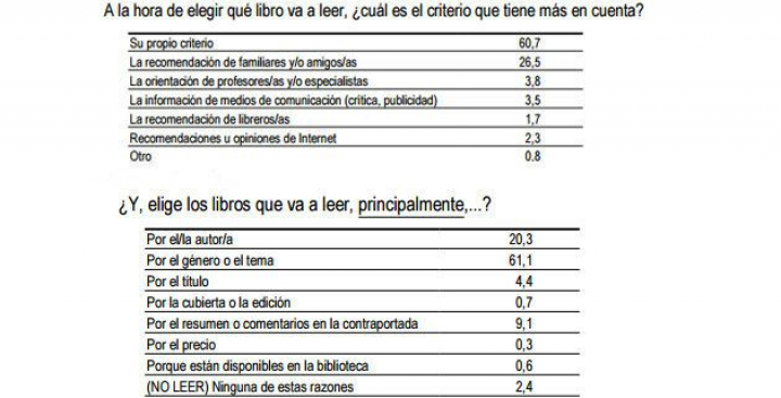 La mayoría de la gente (60,7%) se fía de su propio criterio a la hora de elegir nuevas lecturas y lo más importante para decidirse a abrir un libro es la temática, no el autor; muy pocos optan por seguir los consejos de los libreros y las reseñas de los medios.