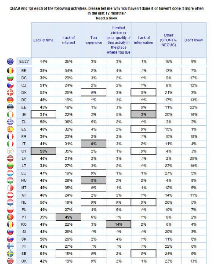 Según otro estudio europeo, la falta de tiempo es el argumento que esgrime el 45% de los europeos, incluidos los españoles, y la principal razón para no leer en todos los países menos Portugal. Al margen de la diferencia en los datos, esto puede significar que la lectura es más común en el resto del continente o que en Europa da vergüenza reconocer que no se lee porque no se quiere.