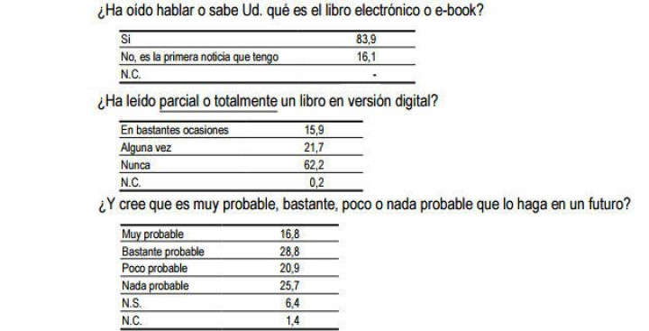 Los libros electrónicos son bastante conocidos —aunque aún hay un 16% de la población que jamás ha oído hablar de ellos—. Sin embargo, constituyen una parte muy pequeña de las lecturas de libros. El 62% de los españoles no ha leído nunca en este soporte y un 25,7% considera que jamás lo hará.