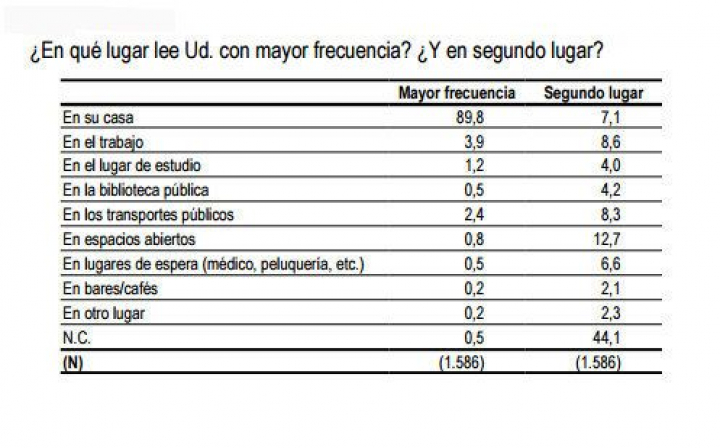 Lo más apreciado de leer digitalmente es la capacidad de llevar en un solo dispositivo una biblioteca entera, seguido de su comodidad porque no pesan y se pueden meter en cualquier sitio. Quizá por eso sus usuarios disfrutan de ellos en lugares más diversos que los que utilizan el soporte papel. El 90% de los que leen, ya sea en formato impreso o electrónico, prefieren hacerlo en casa; curiosamente, el segundo lugar preferido no es el transporte público sino los espacios abiertos (para el 12,7%), y el tercero es el trabajo.