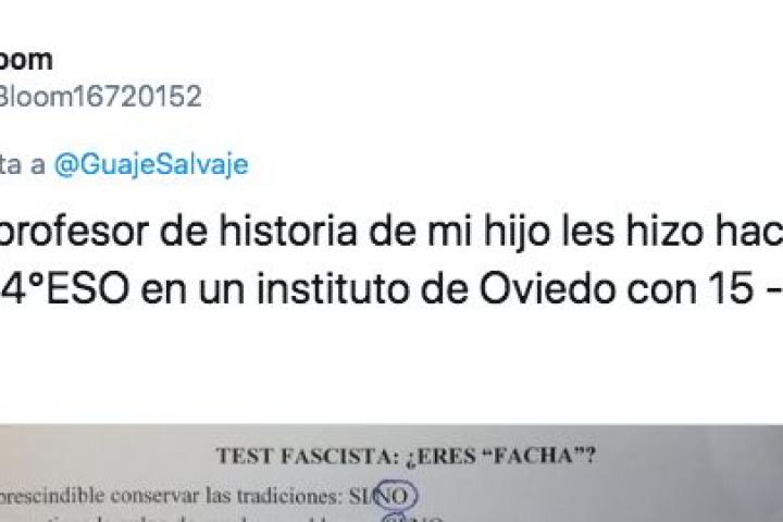 Un usuario de Twitter identificado como @Bloom16720152 ha denunciado en esa red social el test que, según afirma, hizo el profesor de su hijo a los alumnos y que llevaba por título: “Test fascista: ¿eres facha?”.