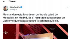 El diputado de Más País Íñigo Errejón compartió este martes en su perfil de Twitter una fotografía de un cartel que había sido colocado en un centro de salud en Móstoles que dejaba ver la situación en la que se encontraba la Atención Primaria en Madrid.