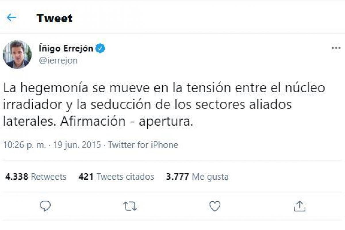 Íñigo Errejón, diputado de Más País, firmó en 2015 uno de esos mensajes que pasan a la historia de Twitter: se convierten en un clásico, se recurre a ellos para cualquier cosa e incluso se hacen camisetas y tazas con ellos.