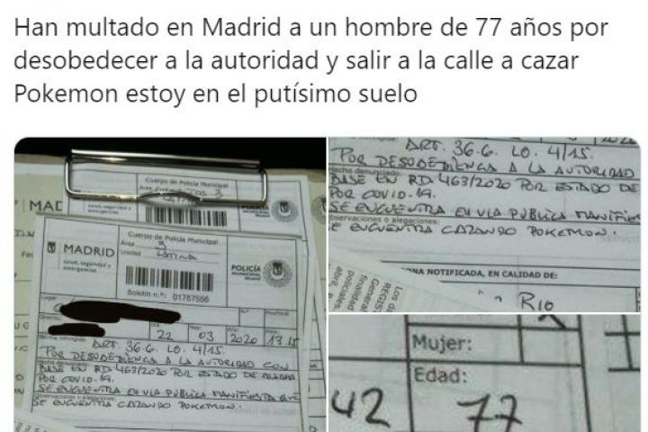 Han multado en Madrid a un hombre de 77 años por desobedecer a la autoridad y salir a la calle a cazar Pokemon estoy en el putísimo suelo pic.twitter.com/Y31OLgVz2w