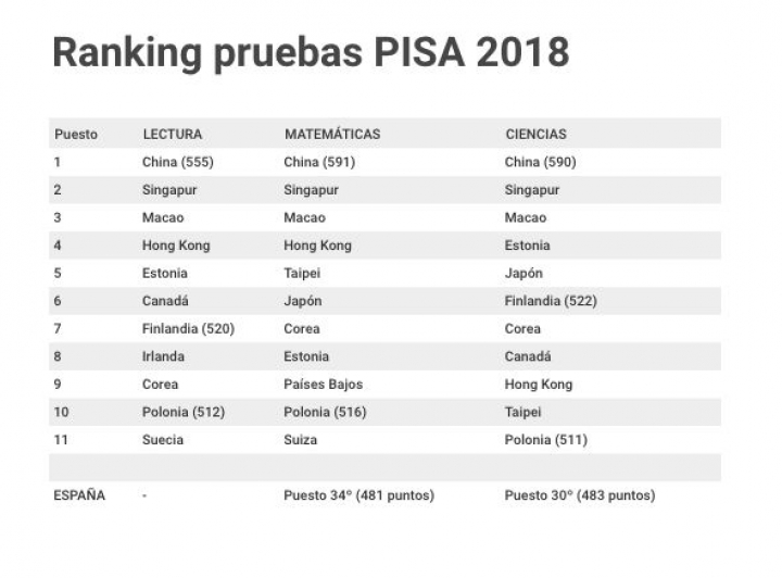 Polonia, que en el año 2000 compartía posiciones con España en el informe PISA, ha ido ascendiendo puestos hasta situarse en el top 10. El país del Este, con la mitad del PIB que España, ha obtenido en este último informe 511 puntos en Ciencia y 516 en Matemáticas, 35 más que España. Por ponerlo en contexto, Finlandia, clásico ejemplo de éxito educativo, tiene 522 puntos en Ciencia y 507 en Matemáticas en la edición de 2018. Y el PIB per cápita del país nórdico triplica el de Polonia.