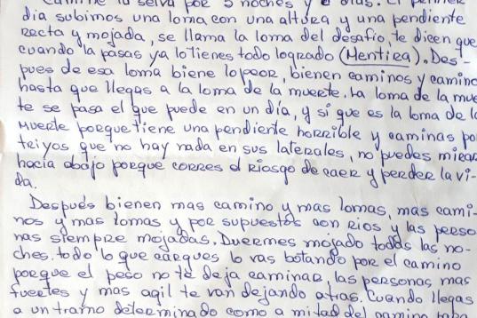 Caminé la selva por 5 noches y 6 días. El primer día subimos una loma con una altura y una pendiente recta y mojada, se llama la Loma del Desafío, te dicen que cuando la pasas ya lo tienes todo logrado (mentira). Después de esa loma viene lo peor, vienen caminos y caminos hasta que llegas a la Loma de la Muerte. La Loma de la Muerte se pasa, el que puede, en un día y sí que es la Loma de la muerte, porque tiene una pendiente horrible y caminas por senderos en los que no hay nada en sus laterales, no puedes mirar hacia abajo porque corres el riesgo de caer y perder la vida.