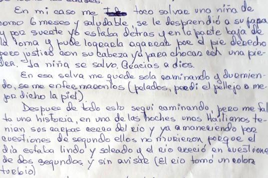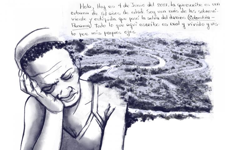 *María es ciudadana cubana, de 51 años. Llegó a Bajo Chiquito (Panamá) después de cruzar la selva del Darién. Fue atendida por Médicos Sin Fronteras, a los que hizo llegar este escrito. Desde principios de año, se ha registrado un aumento en el número de migrantes y peticionarios de asilo que arriesgan sus vidas para cruzar esta selva tropical desde Colombia hasta Panamá y poder continuar con su viaje desde los países sudamericanos hasta México, Estados Unidos o Canadá. La gran mayoría de los más de 15.000 migrantes que han cruzado desde enero hasta mayo el Darién son haitianos y cubanos, aunque se está registrando un aumento de venezolanos y es también notoria la presencia de africanos, indios o bangladeshíes, que llegan a países sudamericanos para los que no necesitan visa, desde los que iniciar su camino a Norteamérica.
