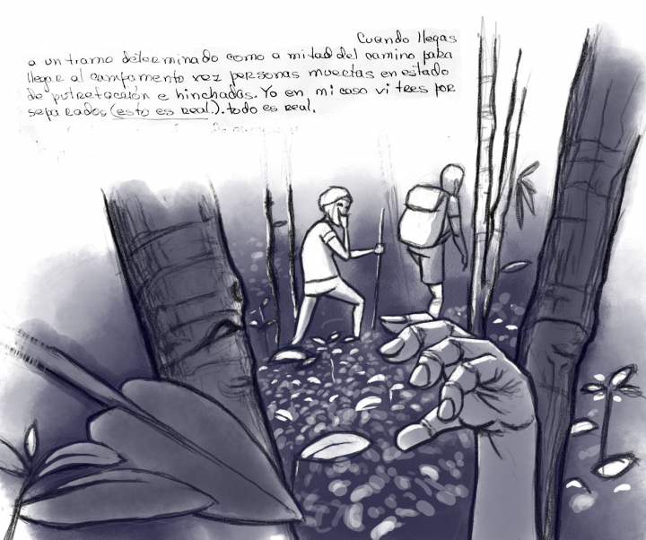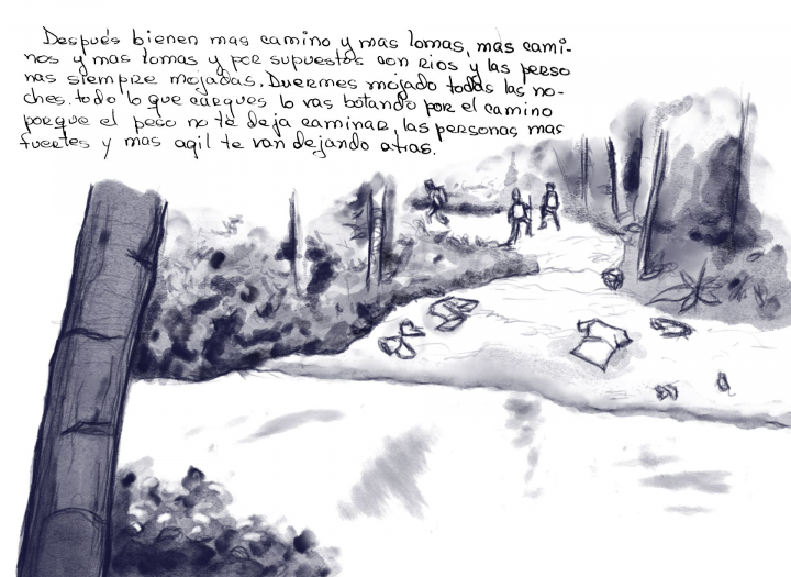 Después viene más camino y más lomas, más caminos y más lomas y por supuesto con ríos y las personas siempre mojadas. Duermes mojado todas las noches. Todo lo que cargues lo vas botando por el camino porque el peso no te deja caminar. Las personas más fuertes y más agiles te van dejando atrás. Cuando llegas a un tramo determinado como a mitad de camino para llegar al campamento (de Bajo Chiquito ya en Panamá) ves personas muertas, en estado de putrefacción e hinchadas. Yo en mi caso vi tres por separado. Esto es real. Todo es real.
