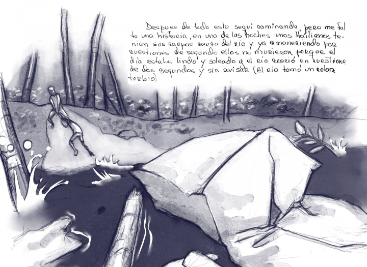 En esa selva me quedé sola caminando y durmiendo. Se me enfermaron los pies (pelados, perdí el pellejo o mejor dicho la piel). Después de todo esto seguí caminando pero me falta una historia. En una de las noches unos haitianos tenían sus carpas cerca del río y ya amaneciendo. Por cuestiones de segundos, ellos no murieron porque el día estaba lindo y soleado y el río creció en cuestiones de dos segundos y sin avisar (el río tomó un color turbio).