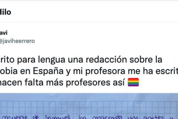 Javier es uno de los muchos estudiantes que se han sumado a esta lucha. Este joven granadino compartió su experiencia en Twitter: hizo una redacción sobre la homofobia y su profesora le escribió una bonita nota a favor del colectivo. Su respuesta compartida por Javier ha conmocionado a muchos usuarios de la red social.