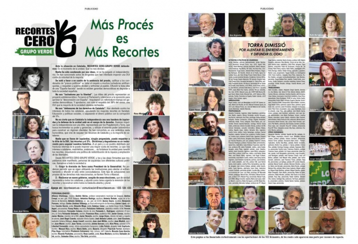 “Reclamar un nuevo gobierno, surgido de unas elecciones, que de verdad represente a todos los catalanes, y aborde como tarea urgente la reversión de los recortes y reconstruir entre todos la Cataluña abierta y plural”, añade el texto.