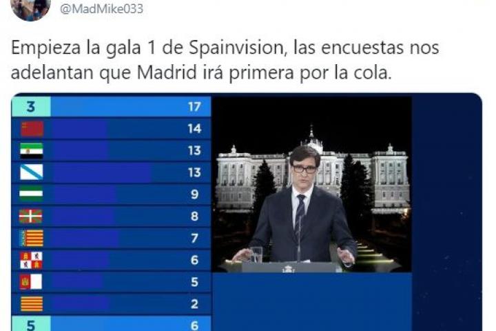 Empieza la gala 1 de Spainvision, las encuestas nos adelantan que Madrid irá primera por la cola. pic.twitter.com/ZFlx91gelD