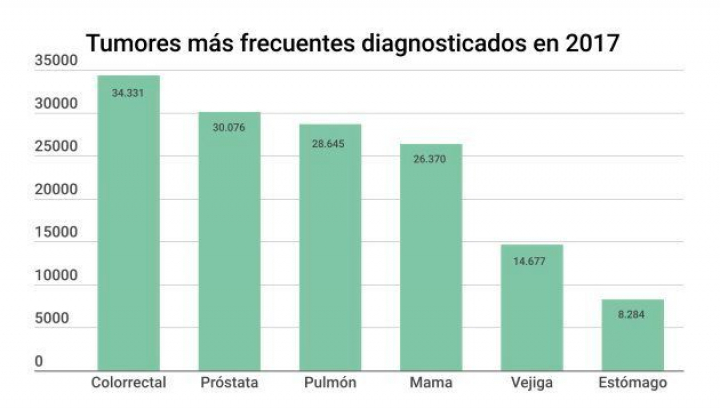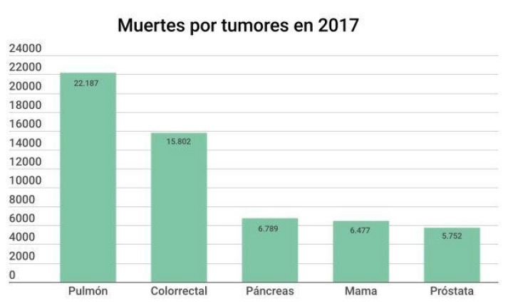 El cáncer fue la segunda causa de muerte en 2016 en España con 112.939 fallecimientos, 68.619 hombres y 44.320 mujeres. Los tumores responsables del mayor número de fallecimientos fueron: