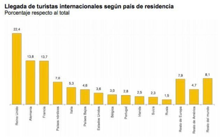 Después de Reino Unido, los principales países de procedencia de los turistas que visitaron España fueron Alemania, con 11,4 millones de visitantes (el 13,8%) y Francia, con 11,3 millones (el 13,7).