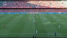 Akanji impuso su fortaleza aérea en un buen saque de esquina con rosca, para picar el esférico y hacer el 0-1 directo a la escuadra, imposible para Simón. El tanto dejaba algo fría a La Romareda y a los de Luis Enrique, obligados en ese momento a remar y remontar el primer golpe visitante. Dos minutos después respondió Sarabia, pero su disparo, algo mordido, acabó en córner.
