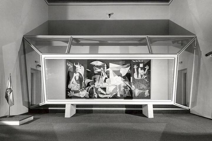 Cuando tenía 9 años me llevaron a ver el Guernica, que volvía de Nueva York. Tengo un recuerdo vivo del contraste del cuadro blanco y negro, tan imponente como los frescos barrocos del Casón del Buen Retiro donde se instaló. Lo recuerdo en un habitación acristalada sobre un suelo blanco. Lo curioso es que hace unos días vi una foto de la sala completa y la habitación no era tal sino una urna inmensa, un relicario blindado superlativo con forma de urna electoral, una supercaja fuerte.
