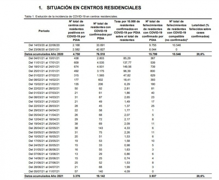 Con las cifras acumuladas hasta el comienzo de 2021 habían fallecido 15.799 internos en residencias por covid con confirmación de su positivo y otros 10.546 perdieron la vida con síntomas compatibles al virus pero sin la confirmación oficial.