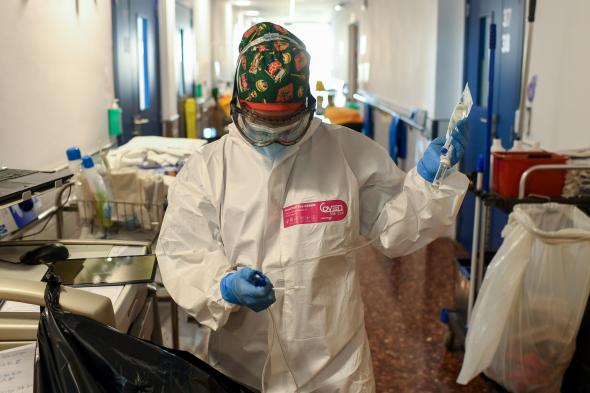 El cuerpo de una persona muerta por Covid, cubierta en su cama de un asilo de Barcelona, el 13 de noviembre de 2020.