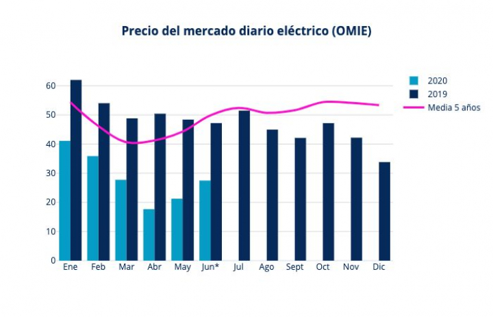 Tras varios años de subidas, el precio del mercado eléctrico bajó un 13,5% en 2019 hasta situarse en los 47,68 euros por megavatio hora. Ahora se encuentra en los 27,47 euros durante la primera quincena de junio, según el Grupo ASE.