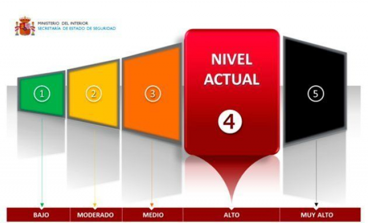 El Ministerio del Interior mantiene hoy la alerta antiterrorista en el nivel cuatro sobre cinco, es decir, hay un riesgo alto de atentado, al igual que en las principales naciones europeas. Este nivel, marcado en rojo por el departamento que comanda Fernando Grande-Marlaska, supone la movilización total de los agentes especializados, que extreman la vigilancia sobre los sospechosos, así como el refuerzo y protección de infraestructuras críticas (centrales nucleares y grandes nudos de comunicación, como aeropuertos y estaciones de tren, sobre todo). Implica igualmente una mayor presencia de las fuerzas de seguridad en las calles y un preaviso a las Fuerzas Armadas para que intensifiquen la seguridad en sus instalaciones y estén preparadas para reforzar a la Policía Nacional y Guardia Civil, en caso de ser requeridas.
