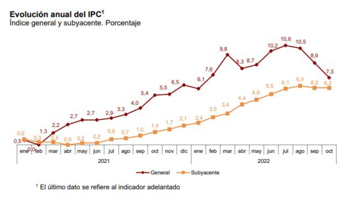 Hace unos días, el INE publicaba los datos adelantados del IPC del mes de octubre, que situaban la inflación interanual en el 7,3% y la subyacente (el índice general sin contar los alimentos no elaborados ni los productos energéticos), que se mantiene en el 6,2%.