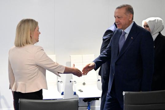 La primera ministra sueca, Magdalena Andersson, saluda a su homólogo turco, Recep Tayyip Erdogan.