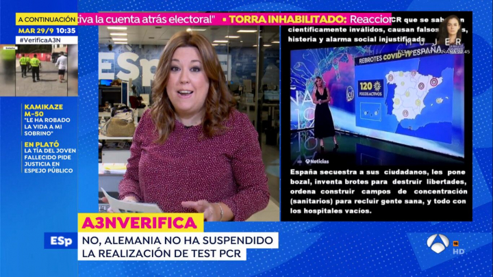 Patricia Escalona, la encargada de la sección de AN3 Verifica del programa Espejo Público, se ha ocupado de desmentir estos titulares. Sobre Alemania, ha explicado que es mentira porque en la “la primera quincena del mes de septiembre se han realizado más de dos millones de test PCR”.