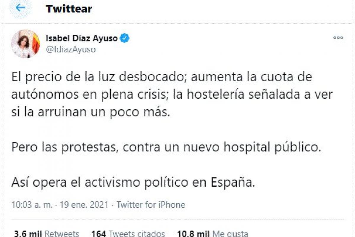 La presidenta de la Comunidad de Madrid, Isabel Díaz Ayuso, está teniendo este martes un día movidito en Twitter, puesto que ha publicado varios mensajes que están dando mucho de qué hablar.
