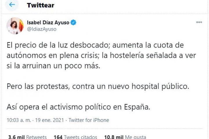 “El precio de la luz desbocado; aumenta la cuota de autónomos en plena crisis; la hostelería señalada a ver si la arruinan un poco más. Pero las protestas, contra un nuevo hospital público. Así opera el activismo político en España”, ha escrito.