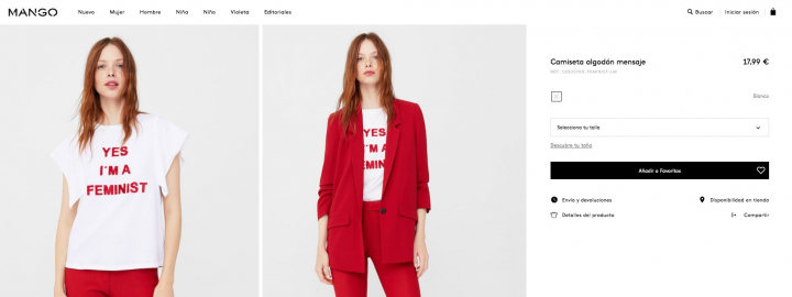 Muestra de ello es que la camiseta, con el mensaje feminista “Yes, I’m a feminist” (sí, soy feminista), está agotada en la tienda de Mango donde se vende por 17,99 euros. Puedes encontrarla y pedirla aquí.