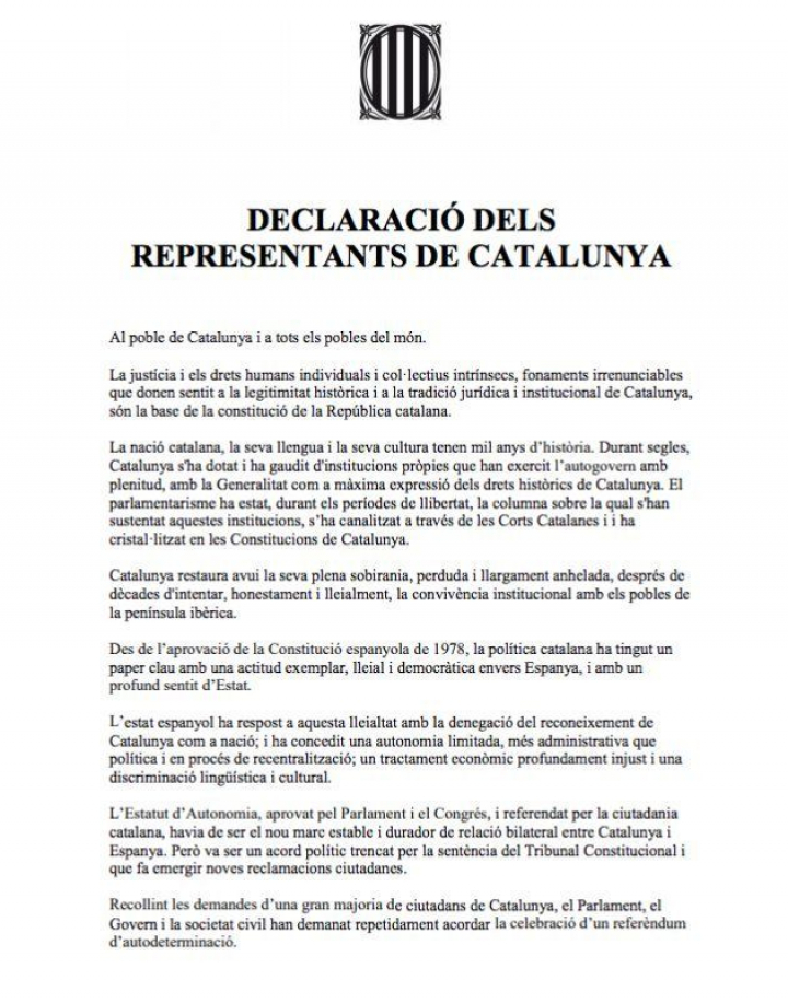 Esta es la declaración que han firmado Puigdemont y los diputados de Junts pel Sí y la CUP