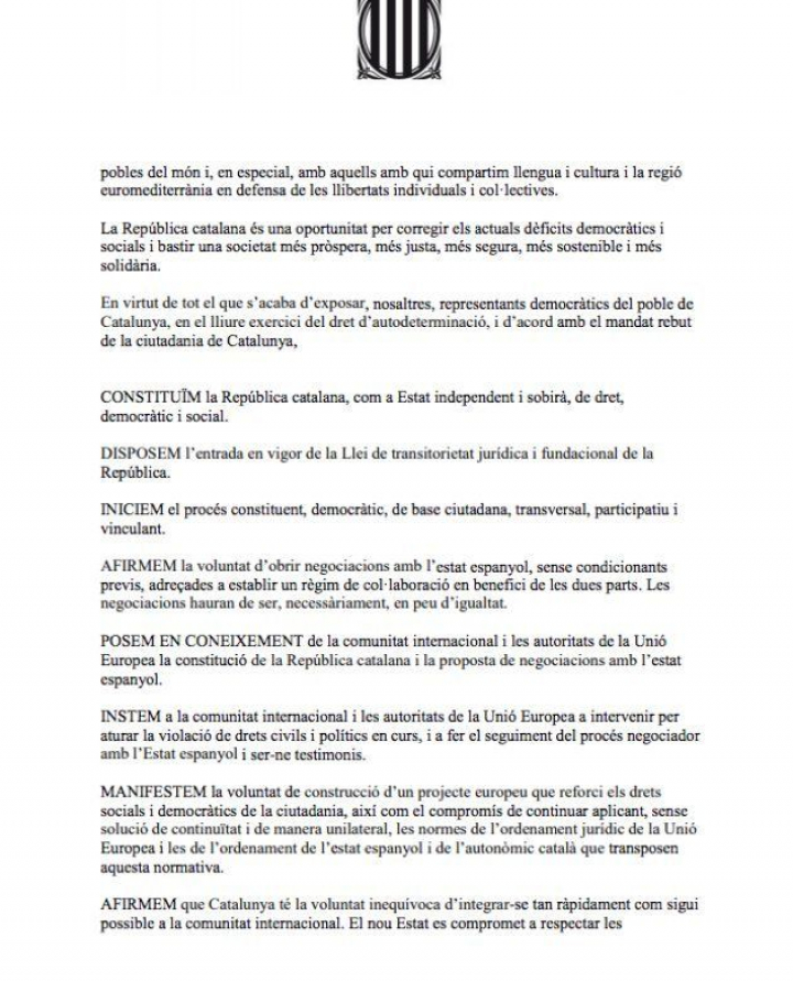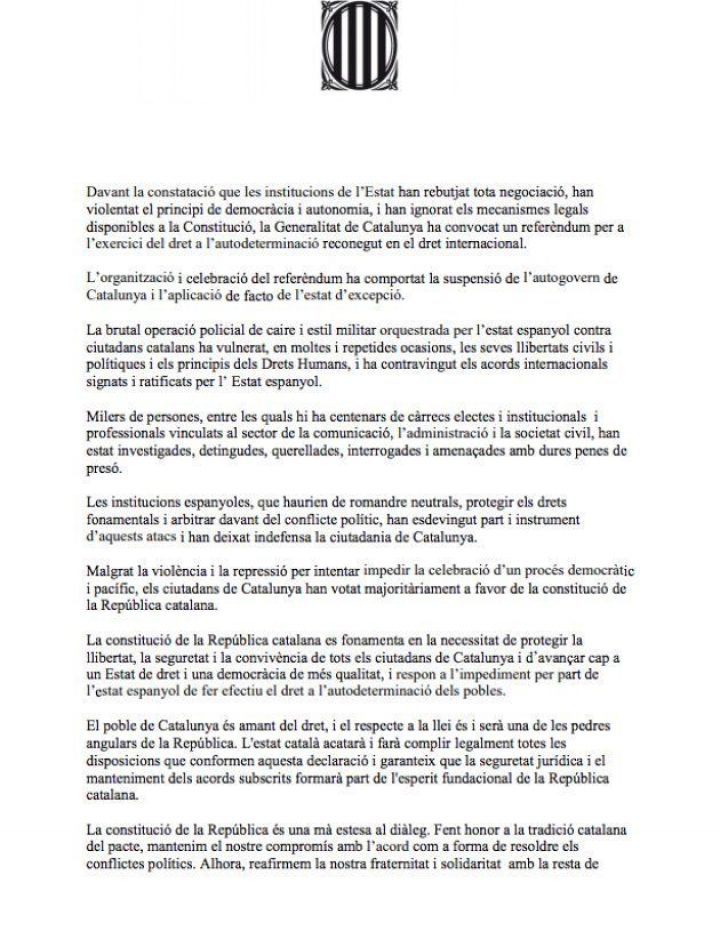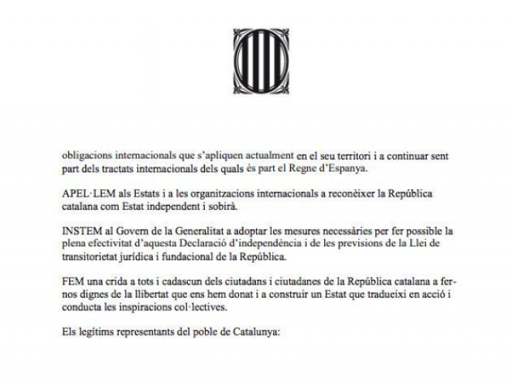 En la declaración de cuatro folios, de carácter simbólico y sin efectos jurídicos porque no será registrada en el Parlament, desaparece cualquier mención a "suspender los efectos" de la declaración de independencia, como había planteado Puigdemont anteriormente en la Cámara.