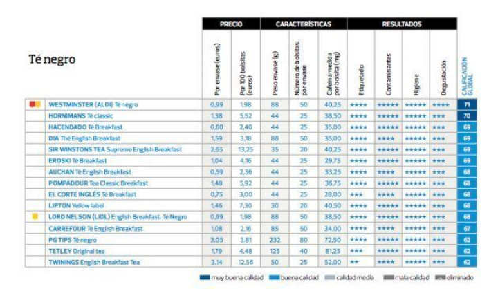 - Westminster Té Negro.Se vende en los supermercados de origen alemán ALDI. El envase cuenta con 50 bolsitas y pesa 88 gramos. Se vende por 0,99 euros, según la web de Aldi. Obtiene una calificación de 71 puntos de 100. "Más del 70% de los catadores afirman que lo comprarían", destaca la OCU.