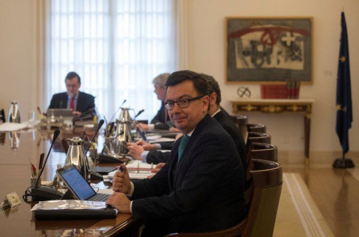 Mientras los informadores gráficos captaban las imágenes de esa primera reunión del nuevo Gobierno, Escolano ha intercambiado comentarios con otros de sus compañeros, principalmente con el titular de Fomento, Íñigo de la Serna.