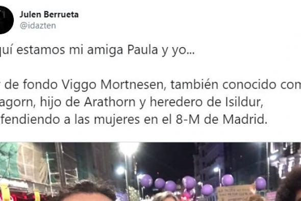 “Aquí estamos mi amiga Paula y yo... ...y de fondo Viggo Mortnesen, también conocido como Aragorn, hijo de Arathorn y heredero de Isildur, defendiendo a las mujeres en el 8-M de Madrid”, escribió en Twitter.