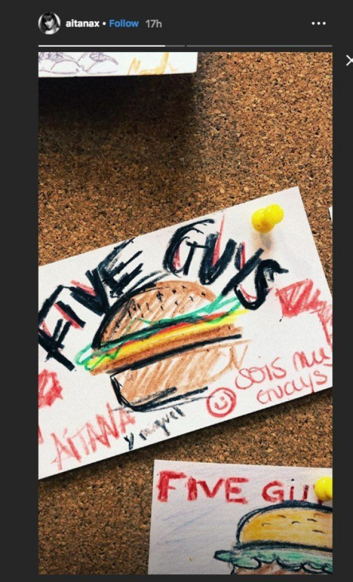 ¿Lo ves? En sus stories se ve un dibujo colgado en el corcho de la hamburguesería Five Guys, donde se dejan por escrito las valoraciones de los clientes al establecimiento. En este caso, el "sois muy guays" lo firman Aitana y Miguel.