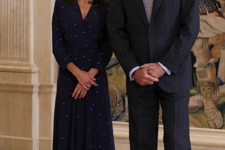 El acto no ha pasado desapercibido para las revistas especializadas en moda por el modelo que ha lucido Letizia. Se trata de un vestido wrap de Maje en azul marino con pequeños destellos plateados.